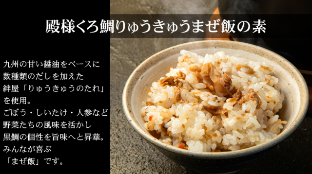 「アタラシイものや体験を応援購入しよう」のmakuakeにて 新商品「殿様くろ鯛りゅうきゅうまぜめしの素 」を先行販売中です!開始3時間で目標達成し、まだまだ更新中! 『まぜめしの素』は炊き立てのご飯に混ぜるだけで手軽に美味しく召し上がれますので、忙しい朝はもちろん、仕事からお帰りの際やキャンプなどのアウトドアでもササっと準備できるスグレモノ。是非お試しください。 注文が早ければお得に購入出来るシステムとなっておりますので、ご注文はお早めに。