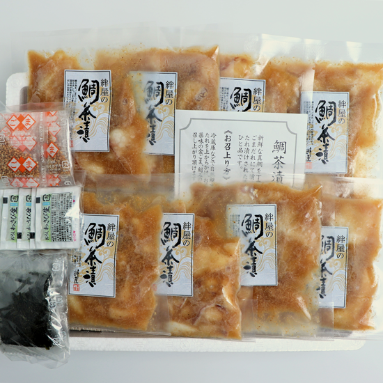 | 商品の中身 | 絆屋の鯛茶漬け70g×8食、刻み海苔0.5g・金ごま1g・わさび2.5g×各8袋 |